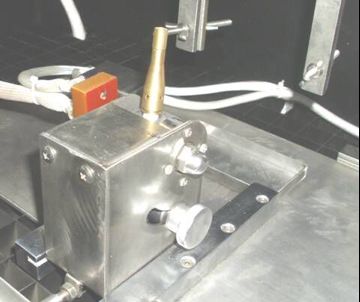 45°-झुका हुआ बर्नर क्षैतिज रूप से तब तक आगे बढ़ता है जब तक कि लौ (लंबाई 20 मिमी) पूर्व-निर्धारित संपर्क बिंदु तक नहीं पहुँच जाती