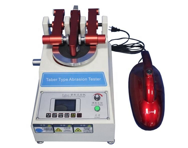 Professional testing equipment designed to evaluate the abrasion resistance of various materials including rubber, plastic, textile, and electronic components through standardized wear testing procedures.
